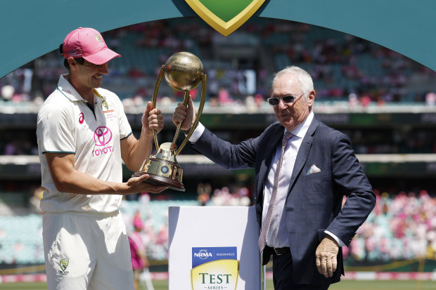 Pat Cummins receives the Border-Gavaskar Trophy from Allan Border in January. Getty