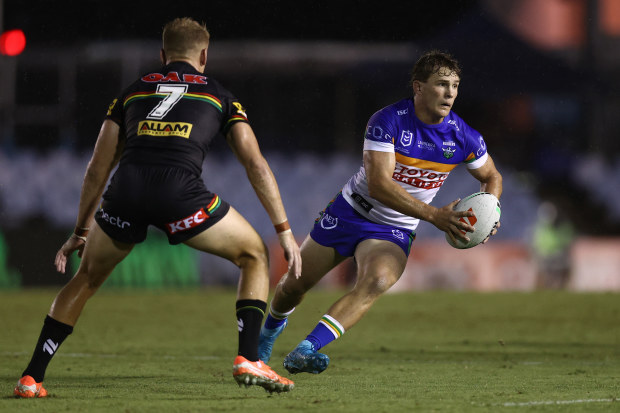 Owen Pattie of the Raiders runs the ball during the NRL pre-season match between Penrith Panthers and Canberra Raiders at Sharks Stadium on February 08, 2025 in Sydney, Australia. (Photo by Jason McCawley/Getty Images) Getty