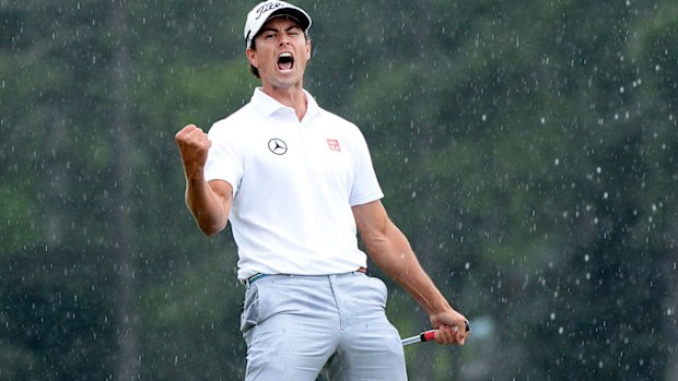 Adam Scott celebrates after making the winning putt at the 2013 Masters. Getty