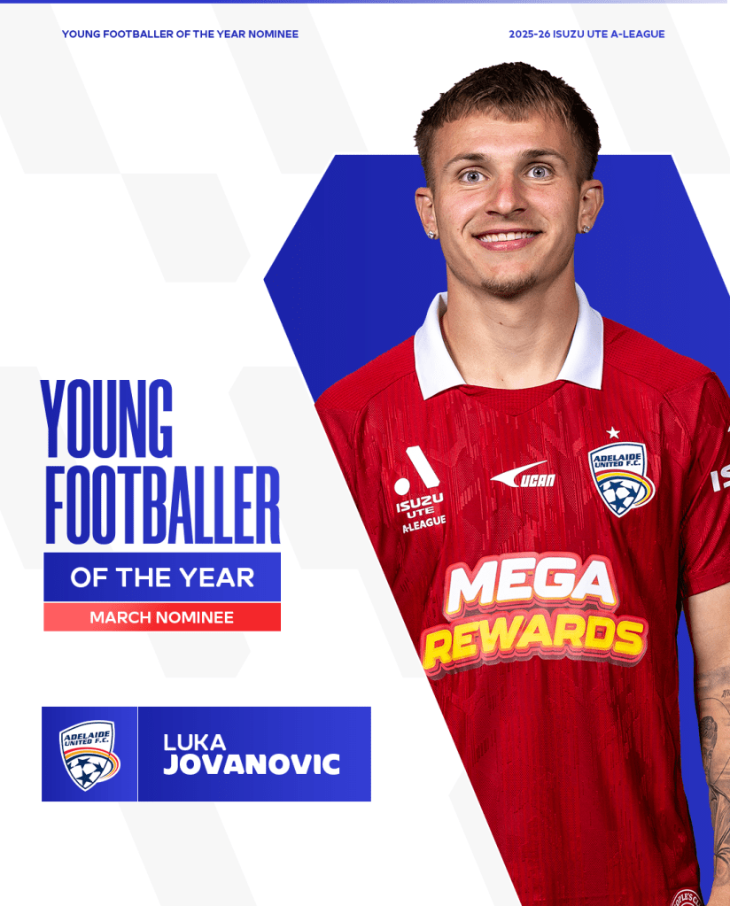 Adelaide United striker Luka Jovanovic has been recognised for his outstanding recent performances, receiving the nomination for Young Footballer of the Year for March in the Isuzu UTE A-League.