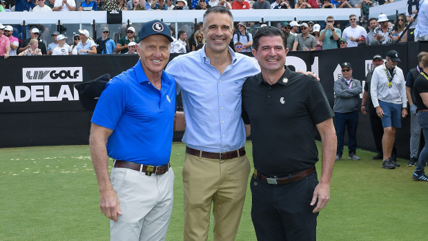 Australian golfing icon Greg Norman, South Australian Premier Peter Malinauskas, and LIV Golf CEO Scott O’Neil declare that LIV Golf will remain in Adelaide until 2031. Getty