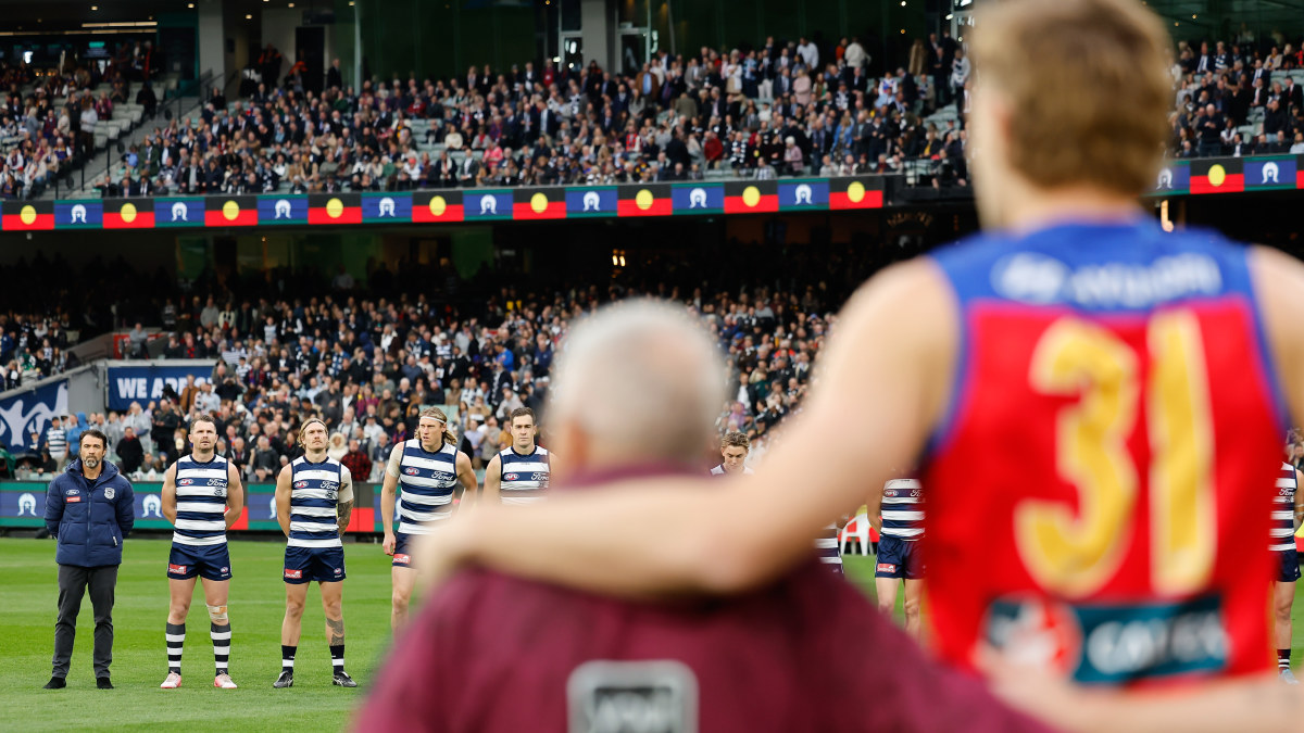 Players and coaches assemble prior to the Geelong Cats versus Brisbane Lions 2024 preliminary final at the MCG. AFL Photos via Getty Images