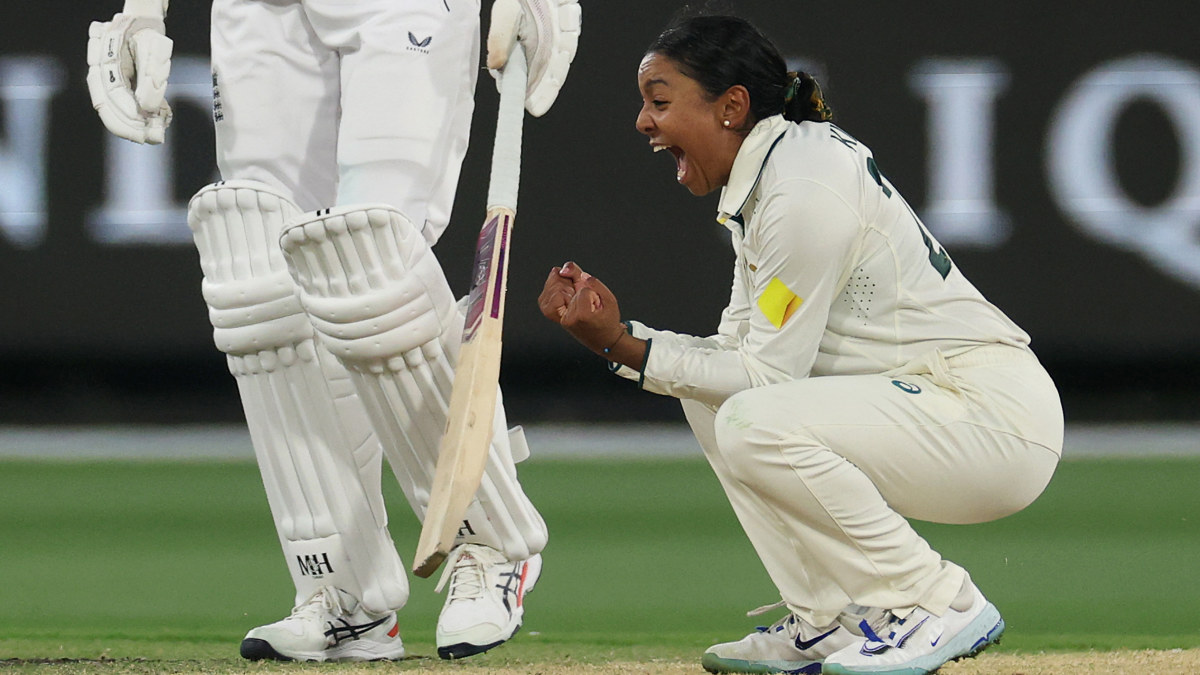 Alana King of Australia celebrates taking the final wicket to win the Women’s Ashes Test. Getty