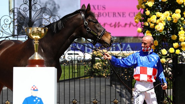 Jockey Glen Boss with Makybe Diva, the three-time Melbourne Cup winner. Getty Images for the VRC