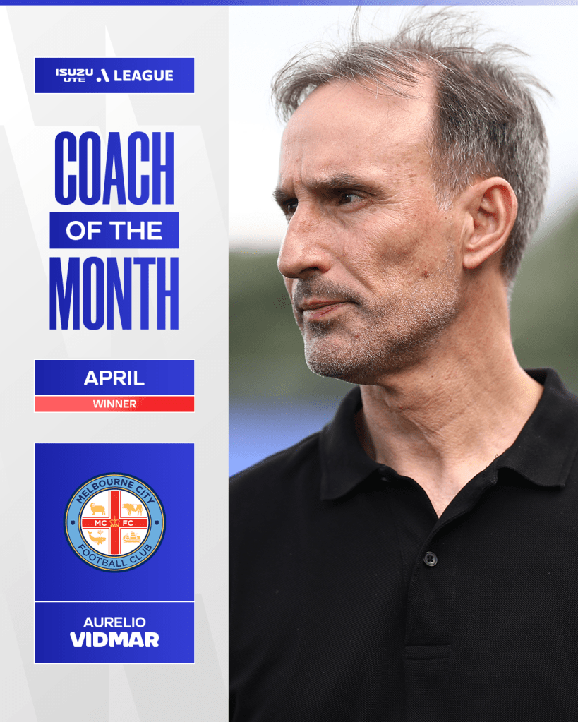 The Head Coach of Melbourne City, Aurelio Vidmar, has been honoured with the title of Coach of the Month for April in the Isuzu UTE A-League.