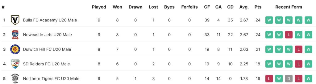 In the U20 division, the Bulls and Jets remain locked at the top of the standings, both on 24 points.
