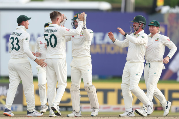 Matt Kuhnemann celebrating after taking a wicket in Sri Lanka. Getty