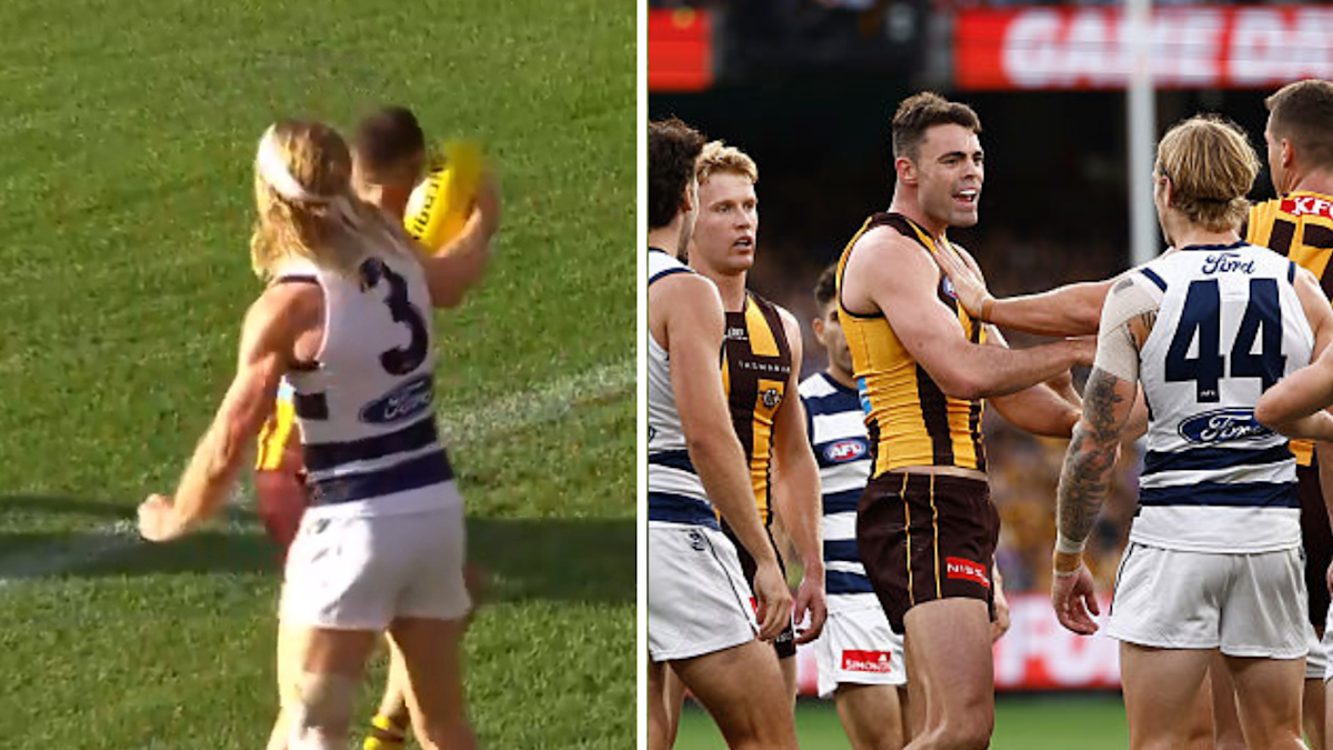 Conor Nash of the Hawks is seen as Gryan Miers of the Cats is taken from the field. AFL Photos via Getty Images
