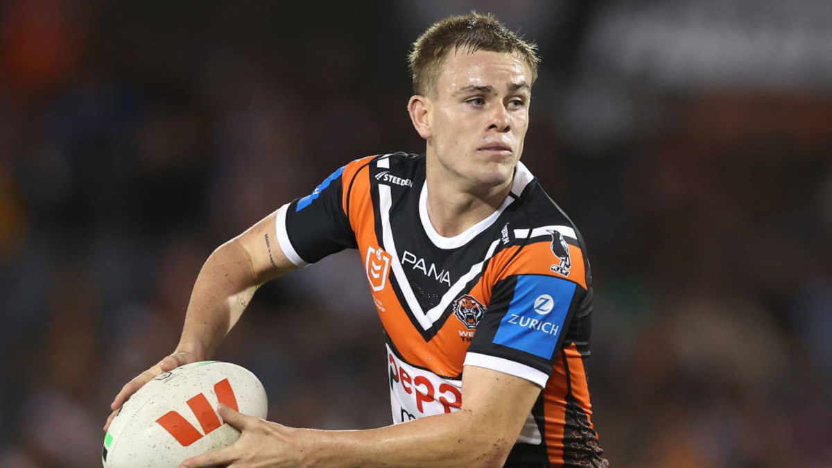 Lachlan Galvin of the Wests Tigers advances with the ball. Getty