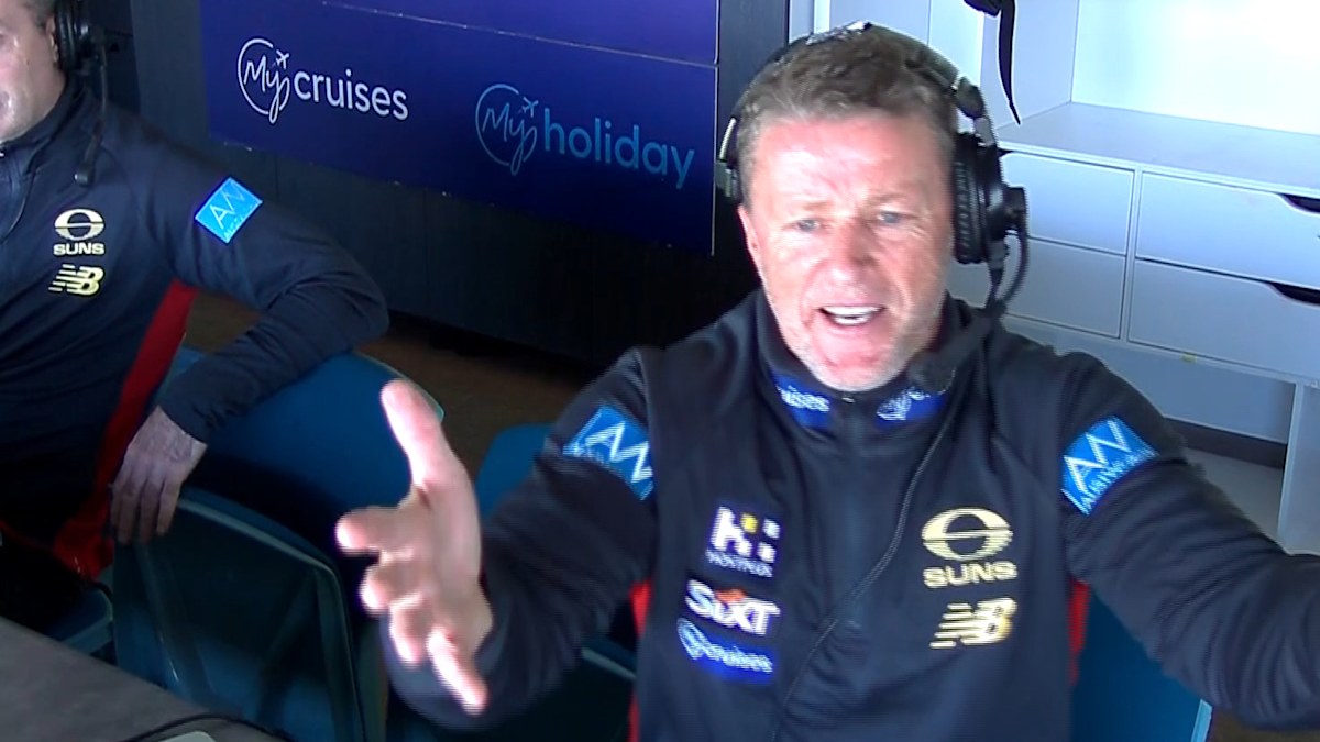 Gold Coast coach Damien Hardwick shows his anger at the decision. Fox Footy