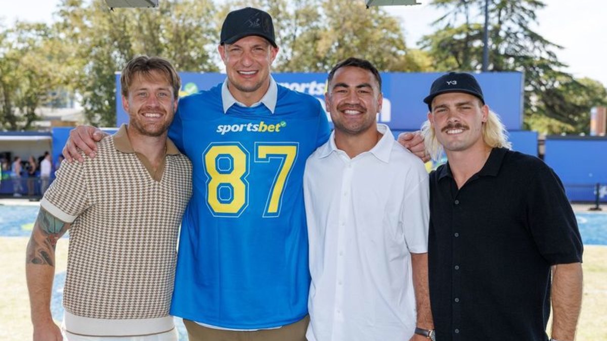 Rob Gronkowski shares a moment with Melbourne Storm players. Sportsbet