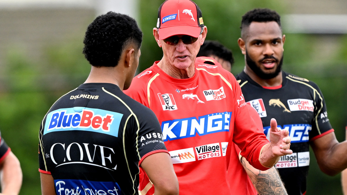 Former Dolphins coach Wayne Bennett strategising with Isaiya Katoa. Getty