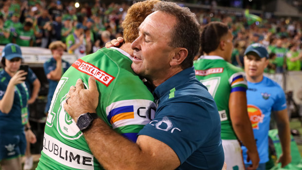 Corey Horsburgh and Ricky Stuart share a moment after the Broncos encounter. NRL Imagery