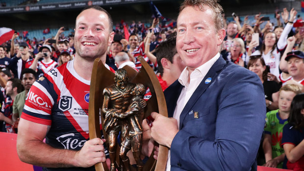 Roosters captain Boyd Cordner and coach Trent Robinson celebrate their 2019 NRL grand final victory. Getty