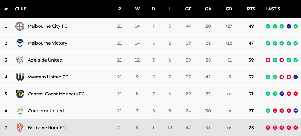 Brisbane had been comfortably in the top six from Round 3 until Round 20 before a dismal performance saw Alex Smith’s team slip out of the Finals Series picture following Round 21. The Roar has suffered seven defeats in their past nine matches and heads into the final two rounds riding a five-game losing streak.