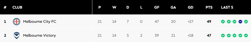 Melbourne City currently tops the league and has the potential to finish the season without a loss. Under the guidance of Michael Matricciani, they have achieved an impressive 21-game unbeaten streak, yet surprisingly have yet to secure the Premiership due to the outstanding performance of their local rivals, Melbourne Victory.