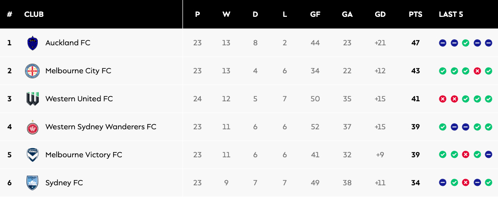 Conversely, victories for Victory and Western Sydney could see Western United plummet from third to fifth by the weekend’s close, while keeping Auckland within striking distance of the four teams below them on the table as we approach the final rounds.