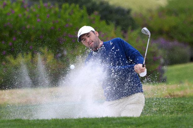 Scottie Scheffler makes a hit out of a greenside bunker on the second hole during the second round of the AT&T Pebble Beach Pro-Am in 2025 at Pebble Beach Golf Links on January 31, 2025, in California. (Photo by Jed Jacobsohn/Getty Images) Getty
