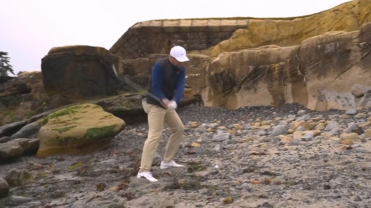 It required a bit of luck, starting with the fortunate discovery of his golf ball. He needed to navigate a longer path to the beach, scaling down a 5-foot rocky ledge before making his way back around 40 yards to find a lower ledge by the water, all while ensuring he didn’t slip. He was also able to adjust some small rocks and seaweed around his ball.