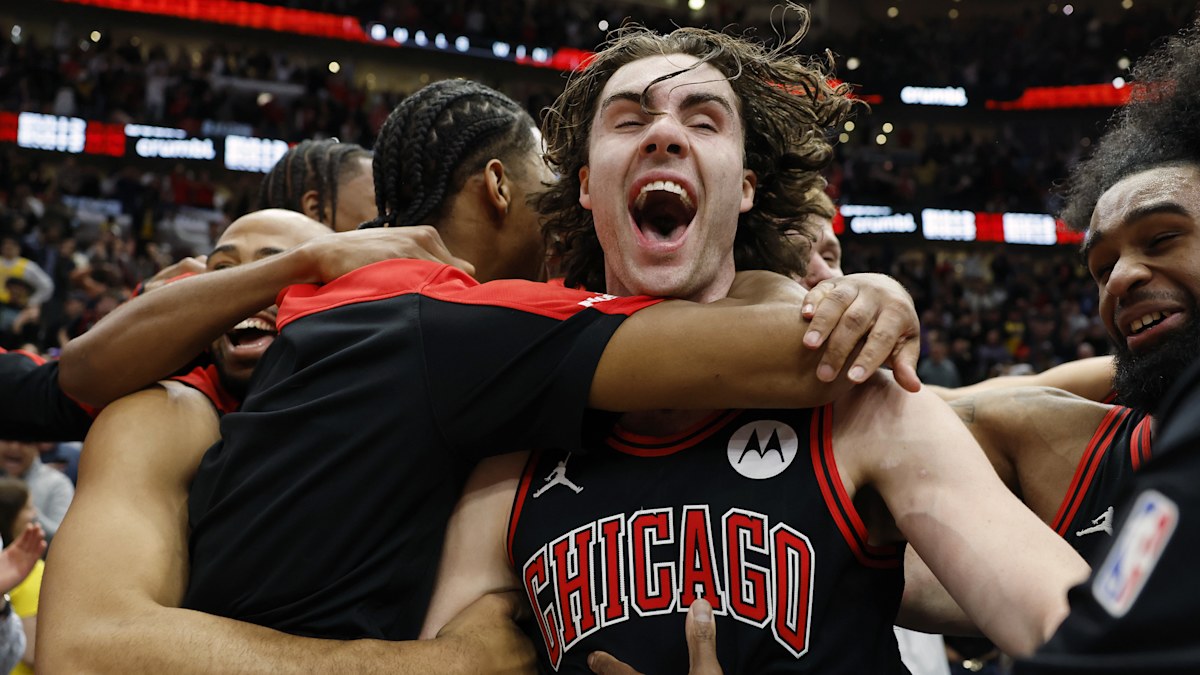 Josh Giddey of the Chicago Bulls celebrates with teammates. Getty
