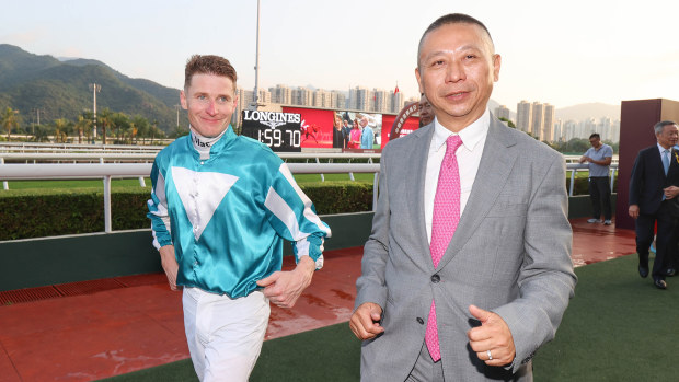 James McDonald and Danny Shum after Romantic Warrior’s triumph. Hong Kong Jockey Club