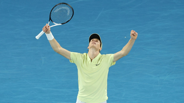 Jannik Sinner celebrates winning the championship point against Alexander Zverev in the men’s singles final at the Australian Open. Photo by Cameron Spencer/Getty Images