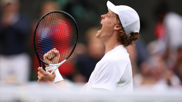 Jannik Sinner of Italy celebrates match point against Carlos Alcaraz of Spain. Getty