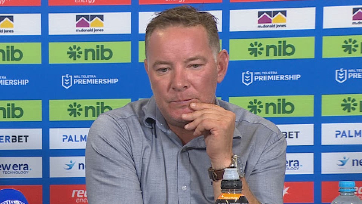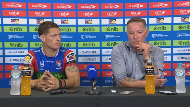 Kalyn Ponga and Adam O’Brien during the post-match press conference. Nine