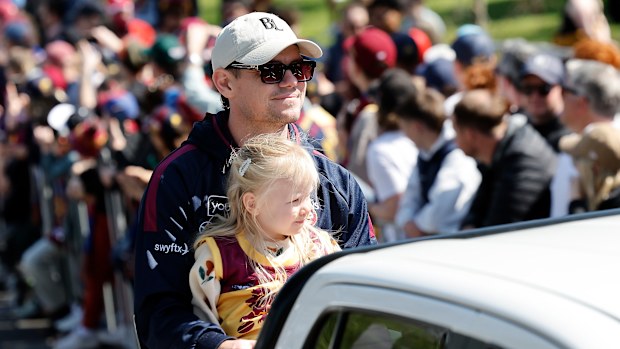 Lachie Neale of the Lions with his daughter. AFL Photos via Getty Images