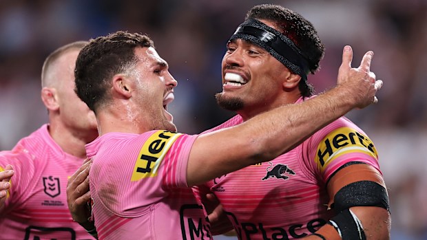 Nathan Cleary celebrates after Isaiah Papali’i scores a try. Getty