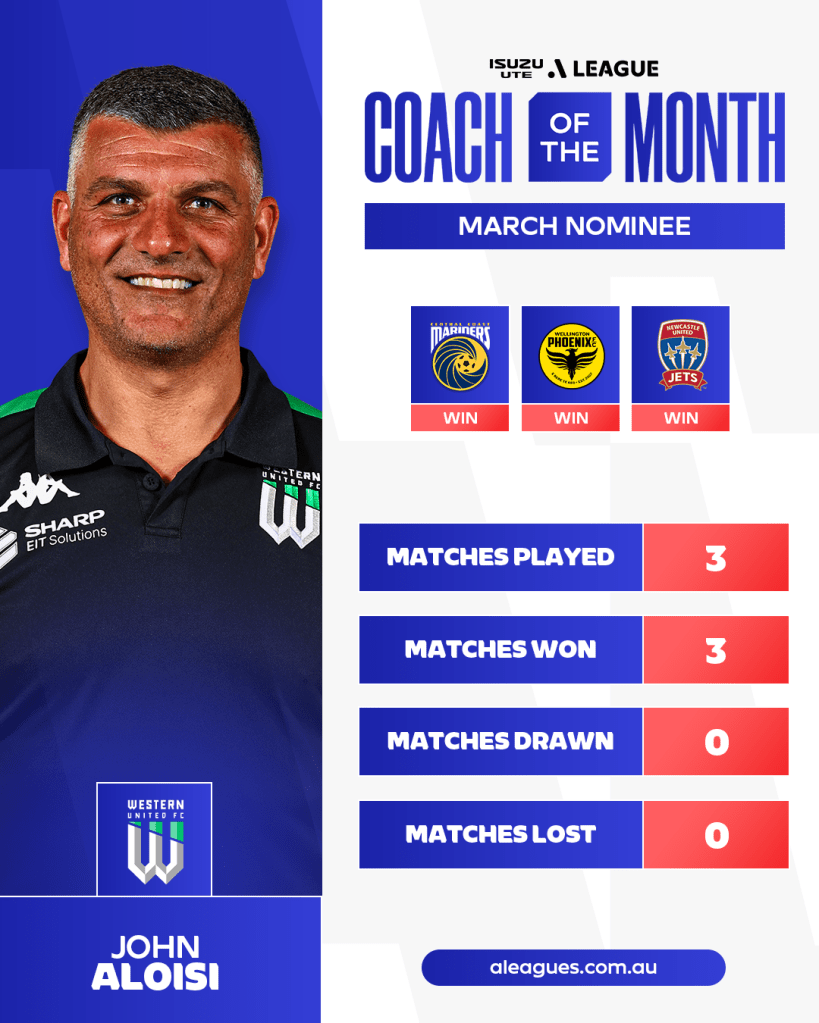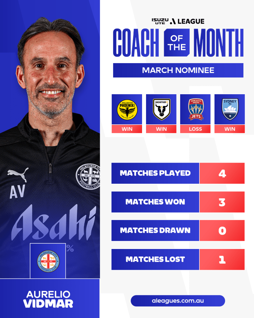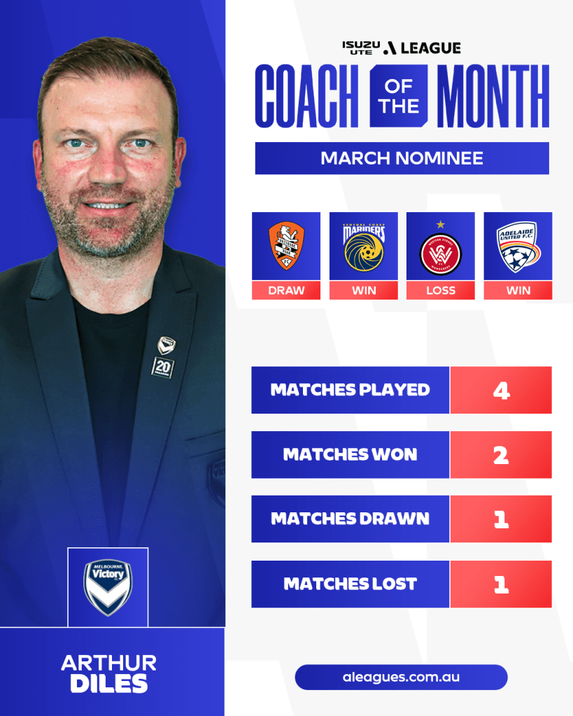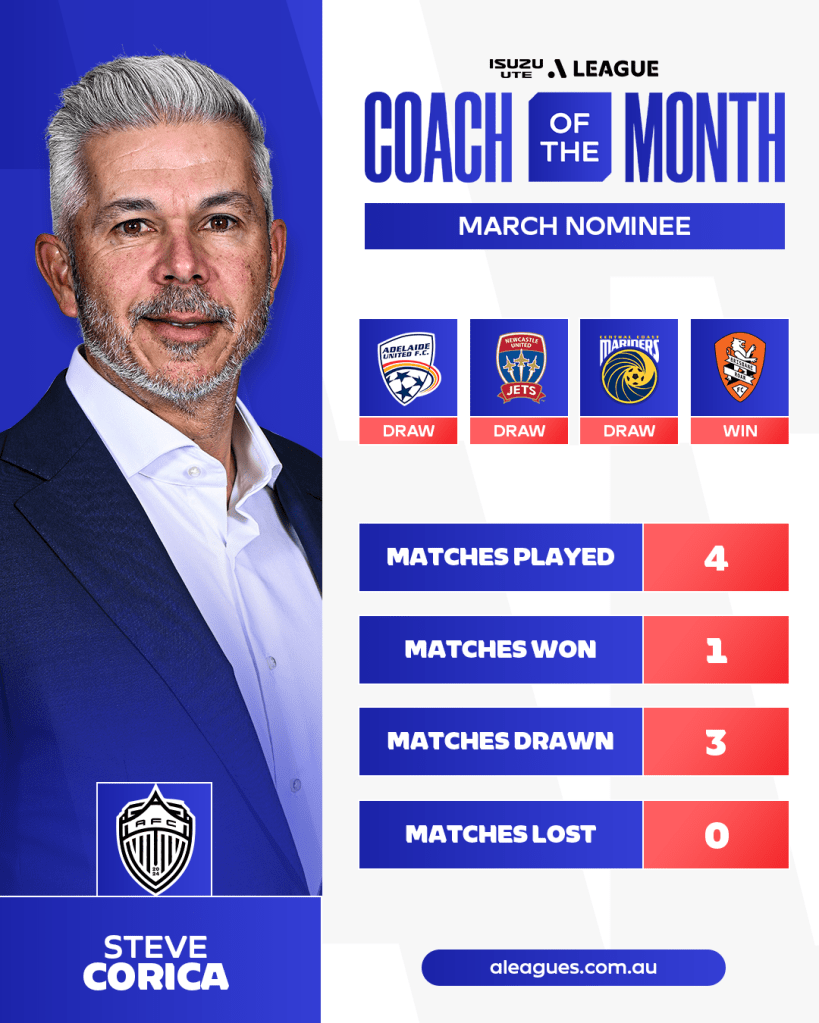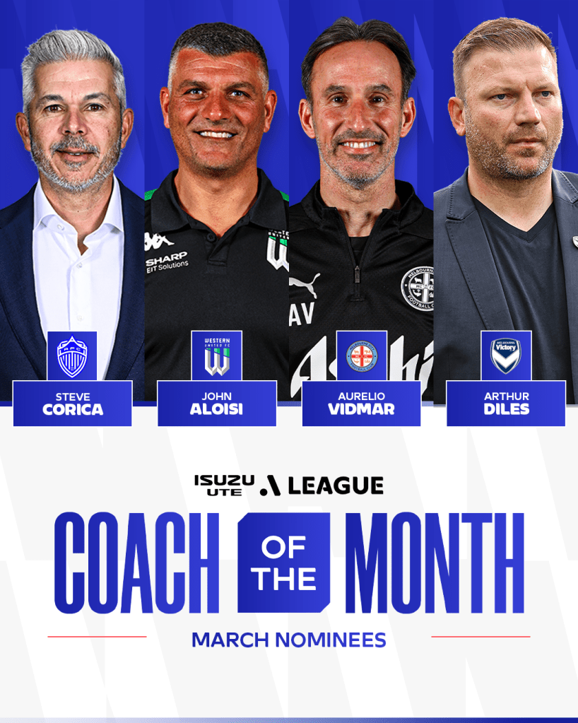 The March eligibility period encompassed Rounds 21-24 of the Isuzu UTE A-League season, considering matches played between February 28 and March 30 for the FCA Panel’s selection of Coach of the Month nominees.