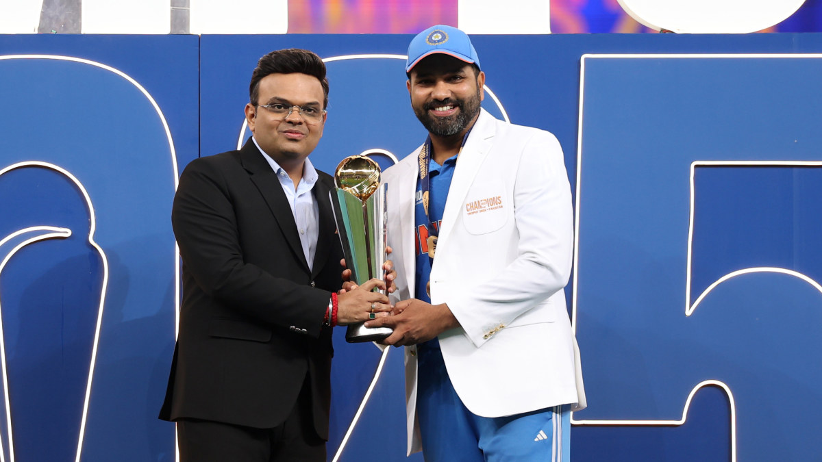 International Cricket Council chairman Jay Shah (left) with Indian captain Rohit Sharma at the Champions Trophy final presentation. Getty