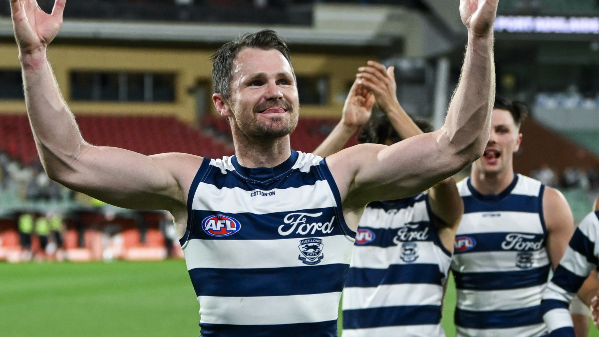 Patrick Dangerfield of the Cats leads his team off after their victory over Port Adelaide Power in the AFL Second Qualifying Final at Adelaide Oval on September 5, 2024. (Photo by Mark Brake/Getty Images) Getty