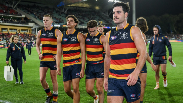 Darcy Fogarty of the Crows leaves the field following their defeat in the round six AFL match against Essendon at the Adelaide Oval. Getty