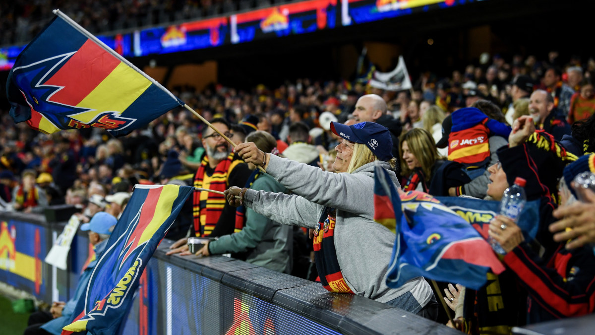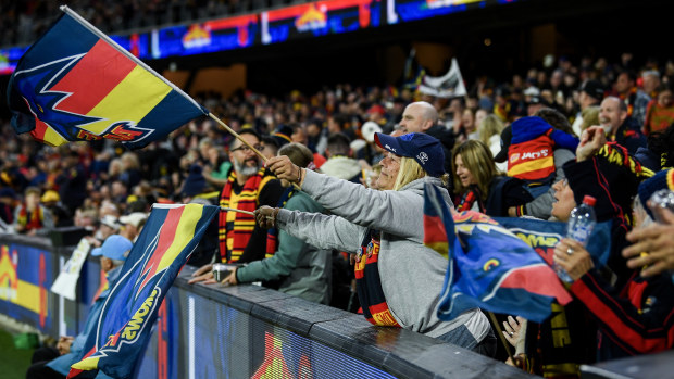 Crows fans celebrating a goal during a match at Adelaide Oval last season. Getty