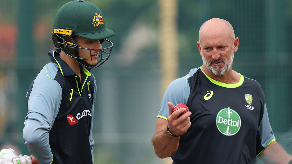 Sam Konstas of Australia converses with batting coach Michael Di Venuto. Getty