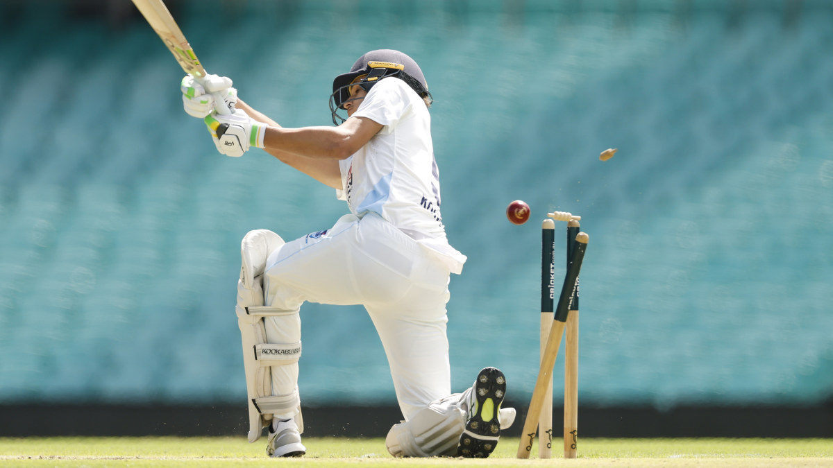 The 19-year-old Test newcomer had his stumps sent flying when he unsuccessfully attempted to smash a delivery from Scott Boland through the leg-side during the third over of NSW’s encounter with Victoria at the SCG.