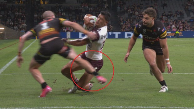 Just before half-time, following a penalty goal by the Sea Eagles, the Panthers restarted play, with Nathan Brown charging from the back fence at CommBank Stadium.