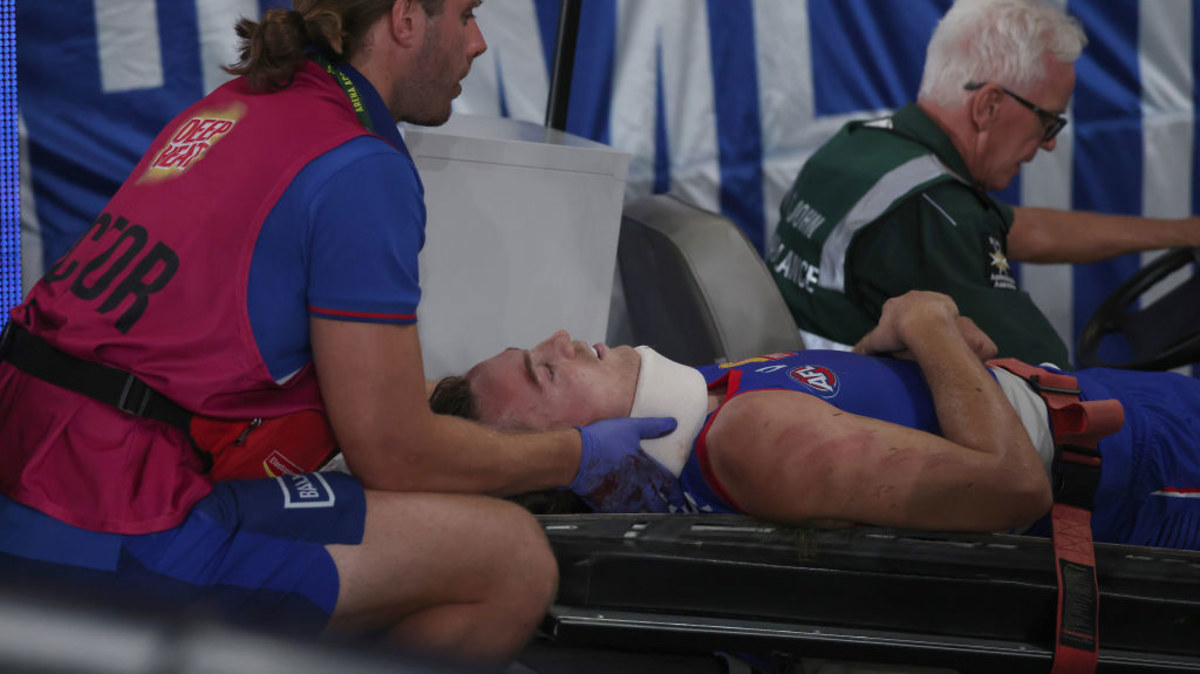 Luke Cleary of the Bulldogs is taken from the ground on a stretcher. Getty