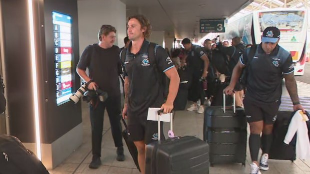 Nicho Hynes arrives at the airport with his Cronulla teammates. Nine