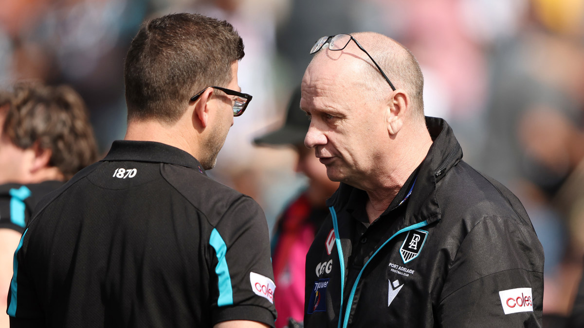 Ken Hinkley engaging with Port assistant Josh Carr. AFL Photos via Getty Images