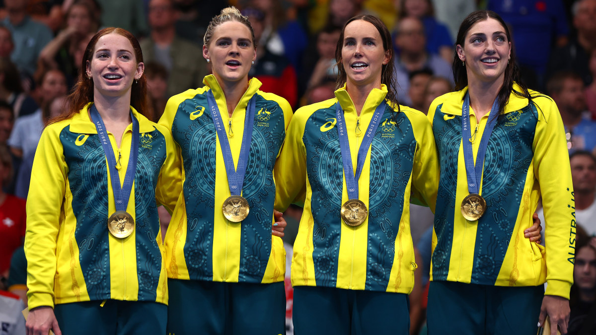 From left: Mollie O’Callaghan, Shayna Jack, Emma McKeon, and Meg Harris celebrate after winning the gold medal in the 4x100m freestyle at the Paris Olympics. Getty