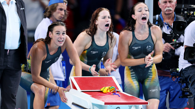 Brianna Throssell, Mollie O’Callaghan and Lani Pallister during the women’s 4x200m freestyle relay final. Getty