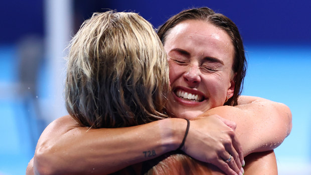 Ariarne Titmus and Brianna Throssell celebrate following gold in the women’s 4x200m freestyle relay final at Paris 2024. Getty