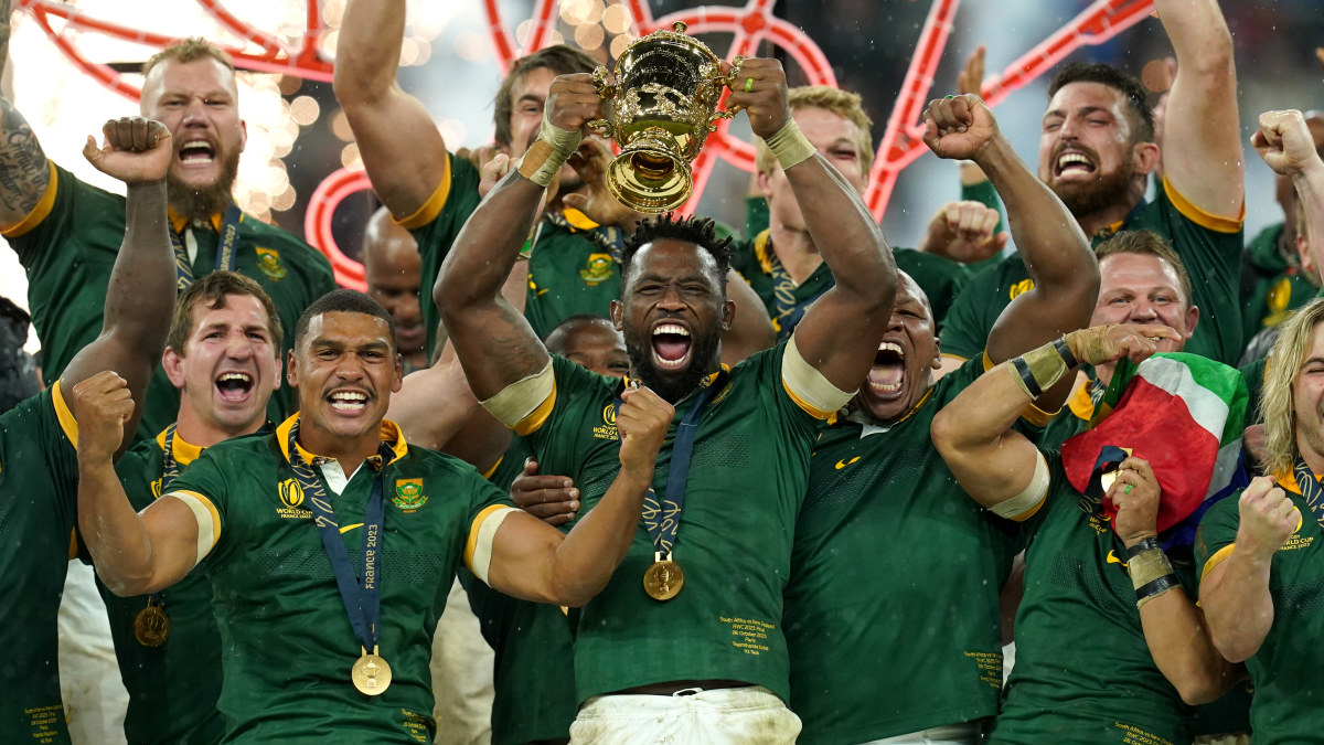 Siya Kolisi of South Africa celebrates lifting the Webb Ellis Cup with teammates after triumphing in the 2023 Rugby World Cup final. PA Images via Getty Images