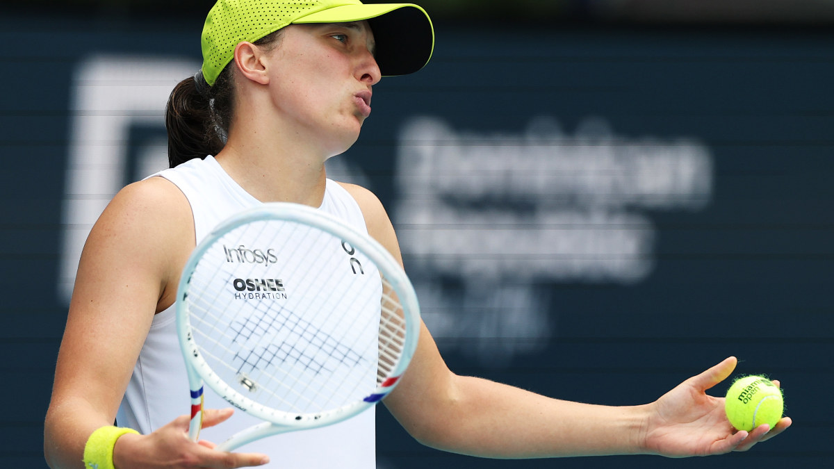 Swiatek displays her reaction after losing a point.Getty