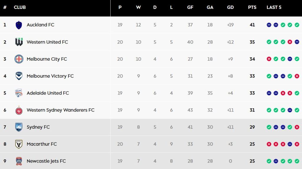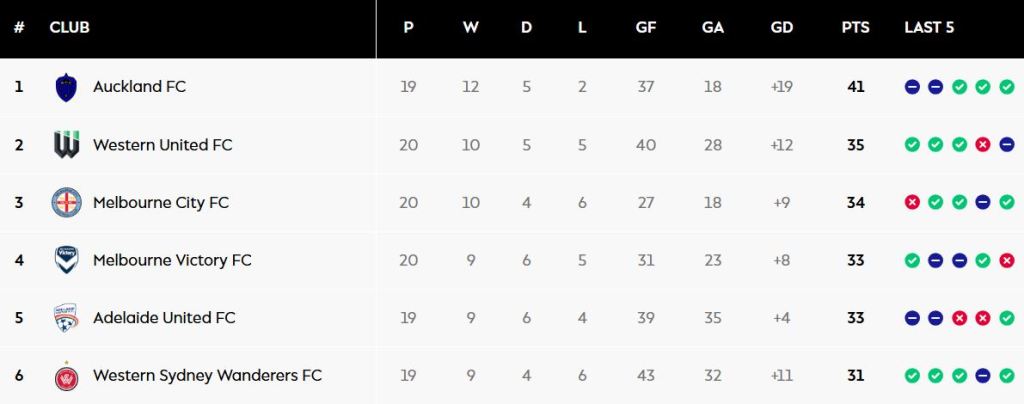At present, Auckland, Western United, Melbourne City, Melbourne Victory, Adelaide United, and Western Sydney Wanderers are in playoff positions, but there are three teams fighting fiercely to break into the top six.