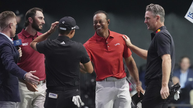 Tiger Woods and Max Homa of Jupiter Links Golf Club greet Collin Morikawa and Justin Rose. AP
