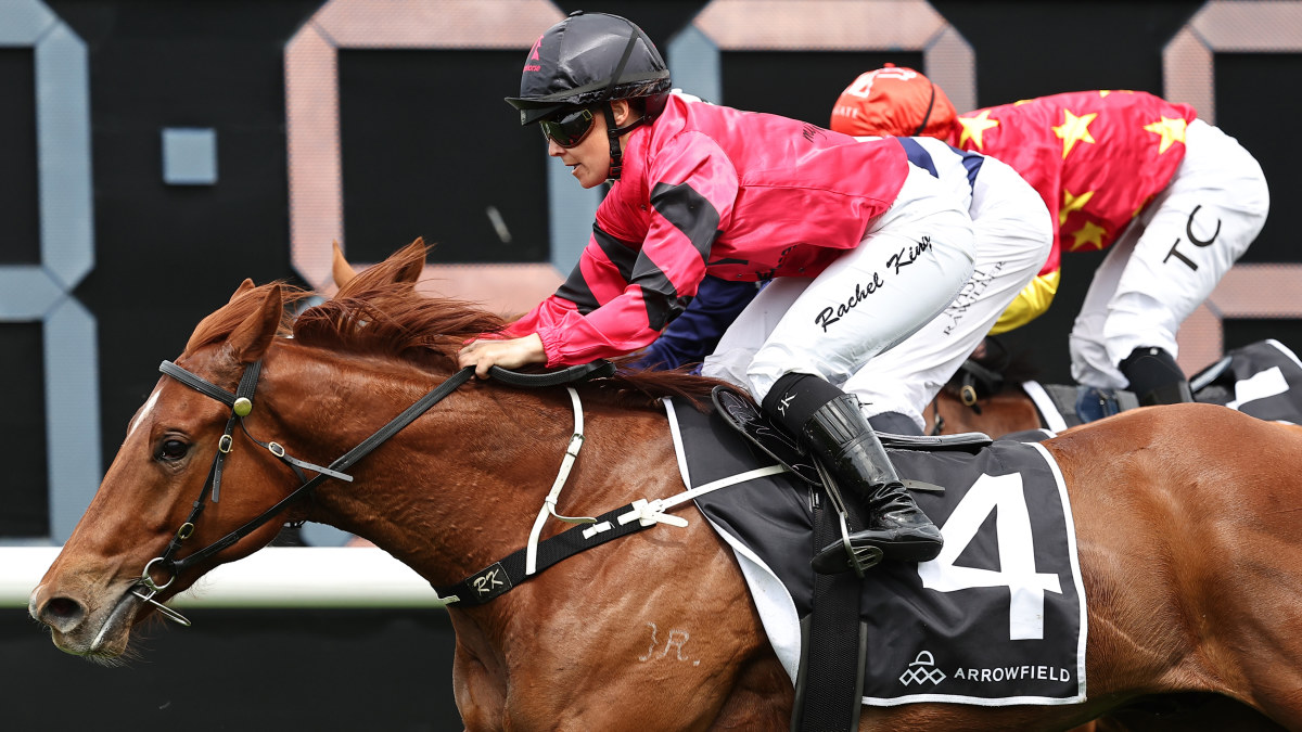 Rachel King aboard King Kirk, celebrating a victory at the Breeders’ Plate. Getty