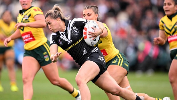 Apii Nicholls competing for the Kiwi Ferns against the Jillaroos. Getty